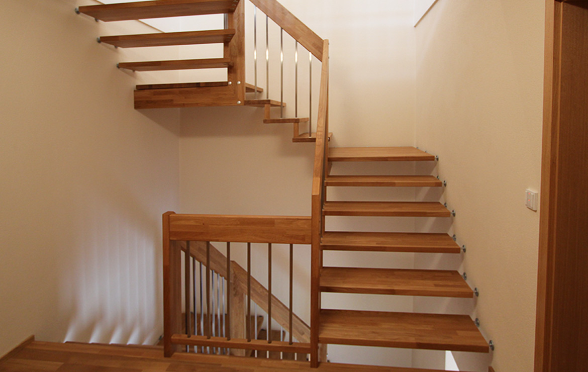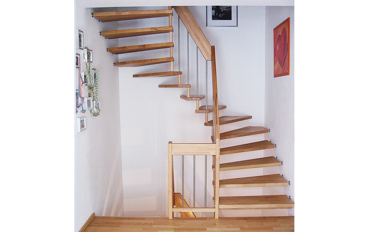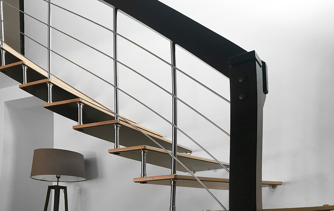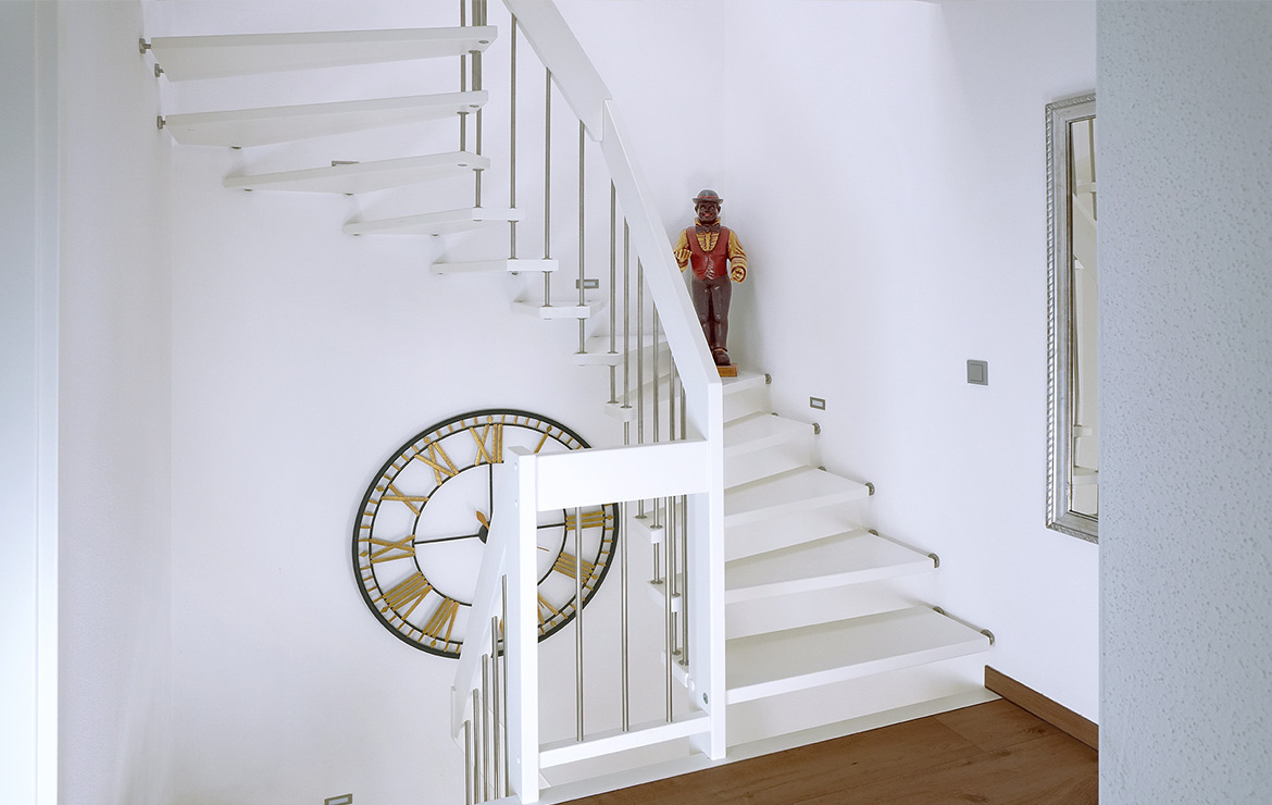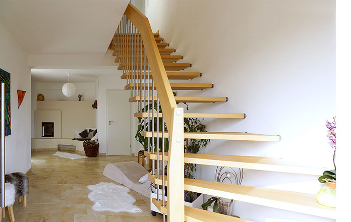 Das Geländer ist Teil der tragenden Konstruktion. Mit der Beschränkung auf das Wesentliche, nämlich Stufen und Geländer, wurde der Treppenbau revolutioniert. Quasi unsichtbar halten die in schalldämmenden Kautschuklagern gehaltenen Stahlbolzen auf der Wandseite die Treppe und das Geländer (Handlauf und Sprossen) die einzelnen Treppenstufen auf der offenen Seite. Eine optimale Verbindung aus Technik und Design, mit vielen Vorteilen.