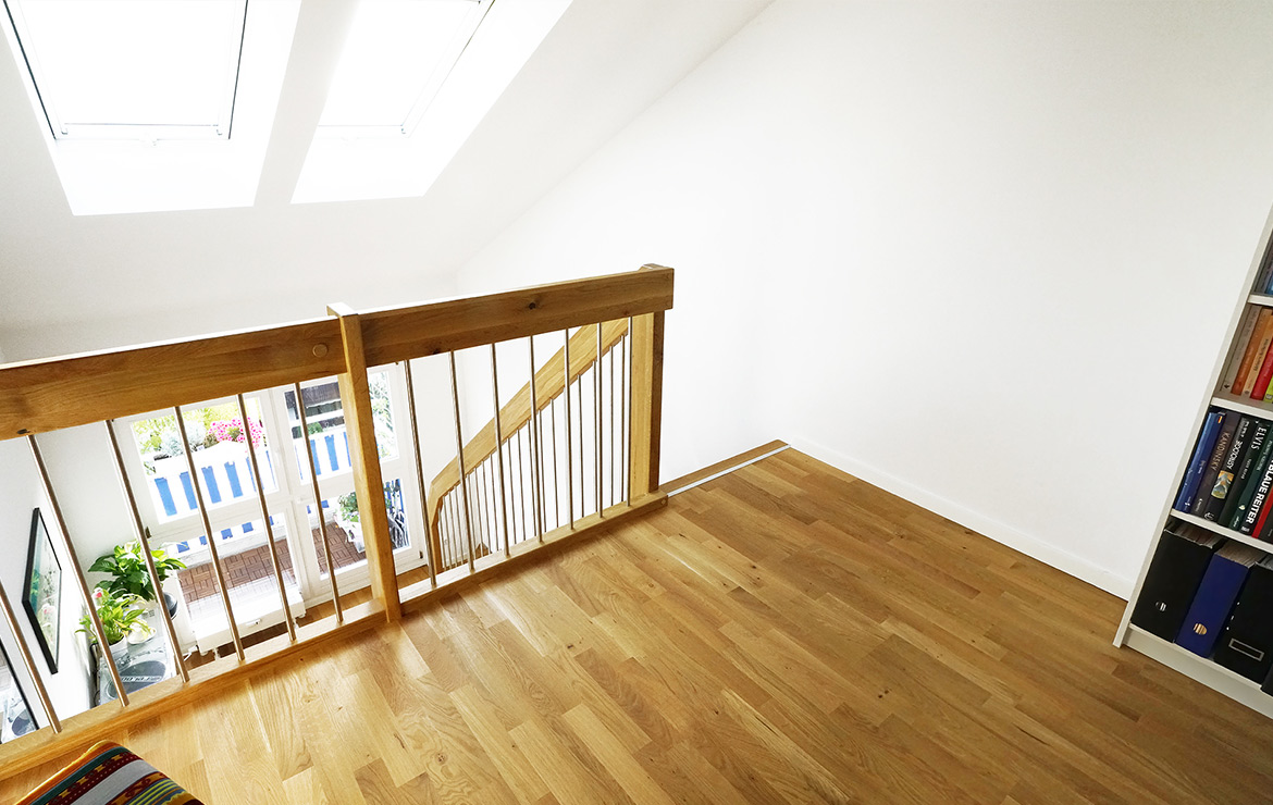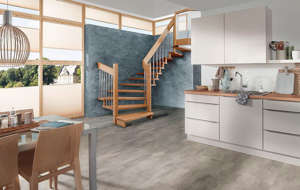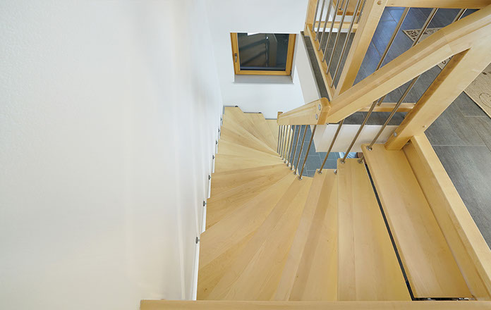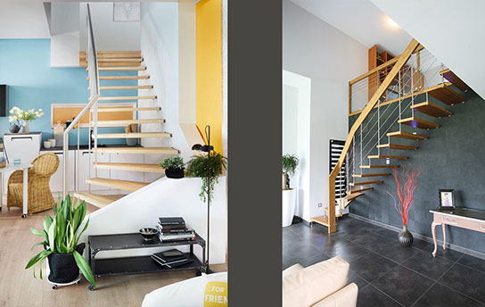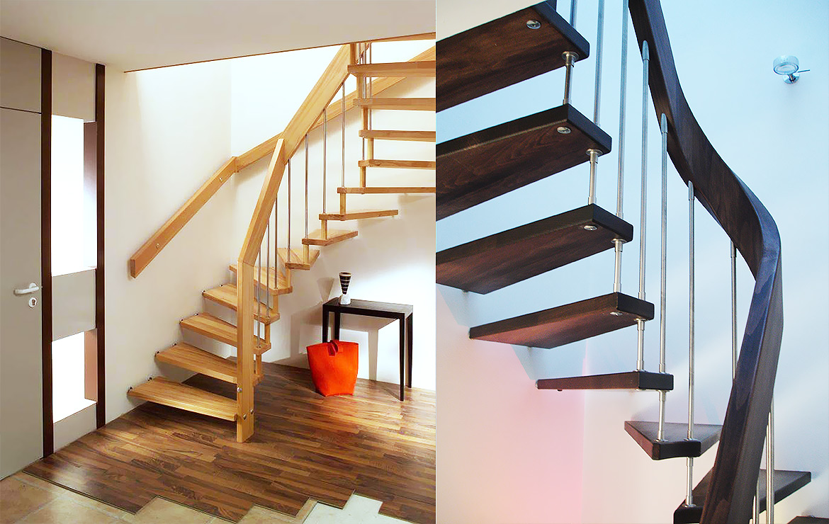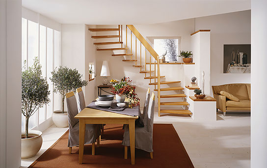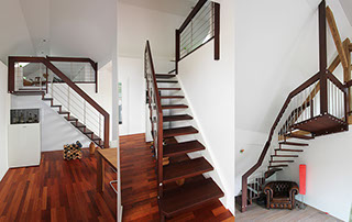 Das Geländer ist Teil der tragenden Konstruktion. Mit der Beschränkung auf das Wesentliche, nämlich Stufen und Geländer, wurde der Treppenbau revolutioniert. Quasi unsichtbar halten die in schalldämmenden Kautschuklagern gehaltenen Stahlbolzen auf der Wandseite die Treppe und das Geländer (Handlauf und Sprossen) die einzelnen Treppenstufen auf der offenen Seite. Eine optimale Verbindung aus Technik und Design, mit vielen Vorteilen.